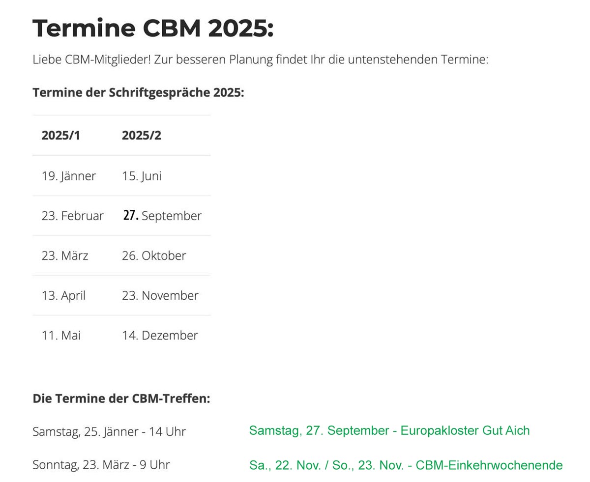 Menschen, die Interesse haben, die CBM kennenzulernen, können Kontakt mit jedem Mitglied der CBM sowie mit Abt Georg, dem Betreuer der CBM oder dem Leitungsteam aufnehmen.